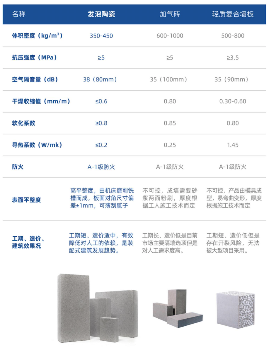 · 輕質:發(fā)泡陶瓷的容重為380~430kg/m?,只有傳統(tǒng)加氣磚的一半重量,可大大減少建筑結構的荷載。