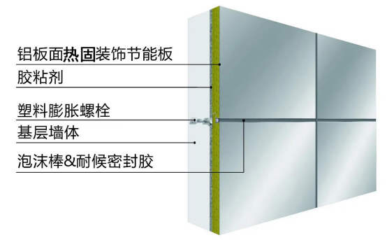 鋁板復(fù)合熱固保溫一體板,采用鋁板與熱固保溫板進行復(fù)合,能夠有效的減少傳統(tǒng)金屬一體板的重量問題,采用專用的粘接膠泥與扣件輔助固定,增加了鋁板復(fù)合熱固保溫一體板與基層墻體的粘接力,降低了金屬一體板由于底板變形而脫落的風險。