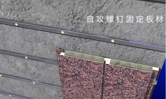 干掛型,這種安裝方式和石材干掛的方式有點(diǎn)類似,需要在墻體基層上預(yù)裝鋼制龍骨,外墻一體板通過特殊的專用錨固件與龍骨連接,一體板與墻體基層間通過填充發(fā)泡聚氨酯或其他材料。
