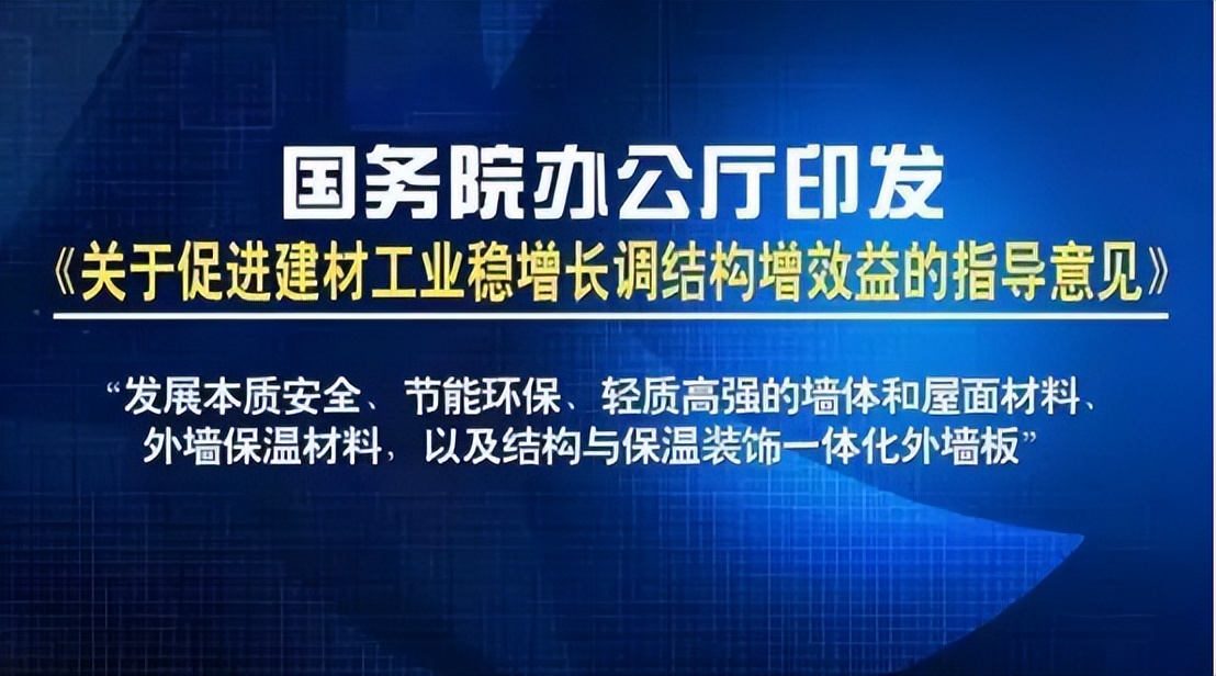 國務院辦公廳印發(fā)《關(guān)于促進建材工業(yè)穩(wěn)增長調(diào)結(jié)構(gòu)增效益的指導意見》中,明確指出“發(fā)展本質(zhì)安全、節(jié)能環(huán)保、輕質(zhì)高強的墻體和屋面材料、 外墻保溫材料,以及結(jié)構(gòu)與保溫裝飾一體化外墻板”。