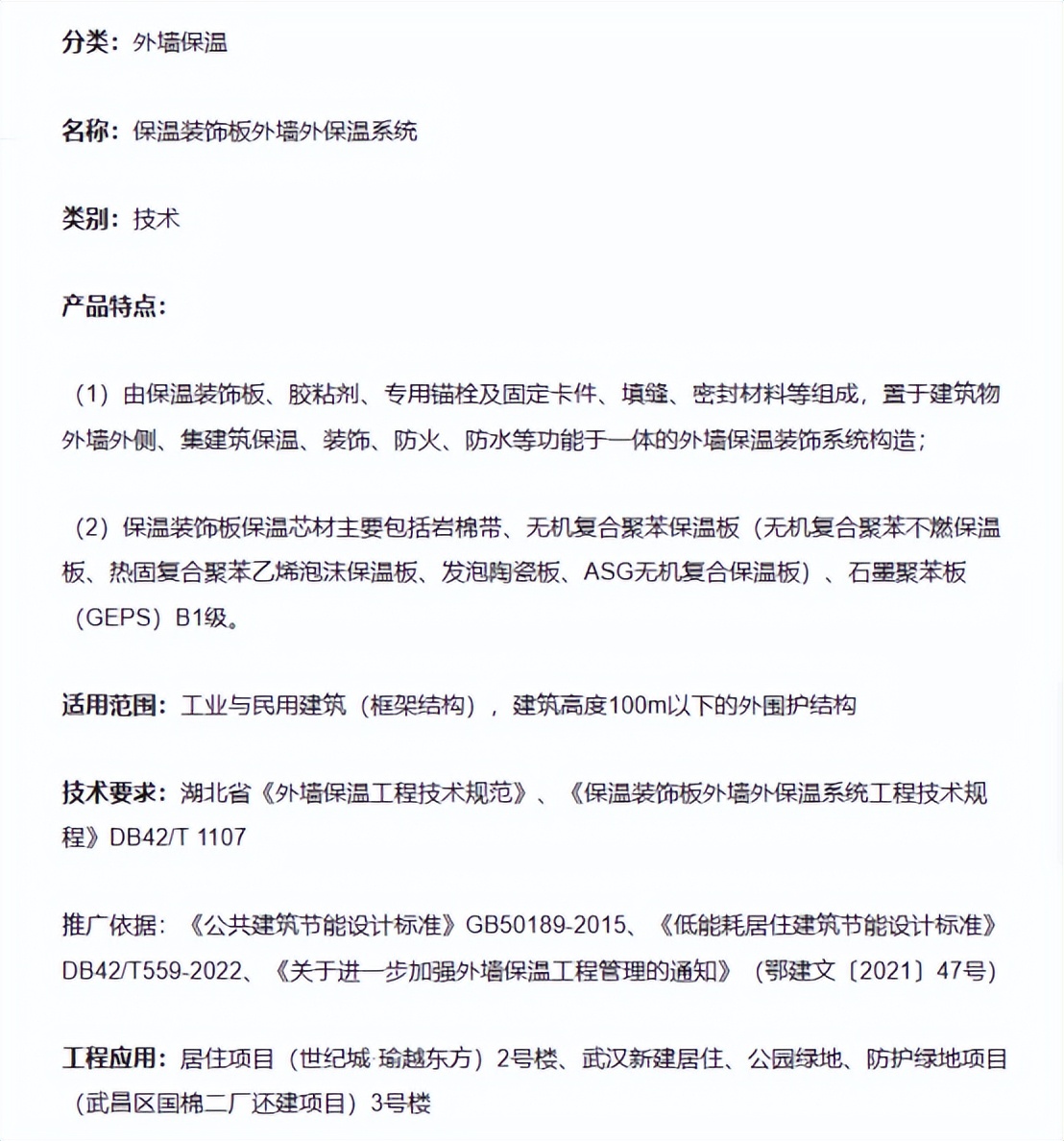 關(guān)于《湖北省推廣、限制和禁止使用建筑節(jié)能與綠色建筑產(chǎn)品、技術(shù)和設(shè)備目錄(2022版)》的公示,保溫裝飾板外墻外保溫系統(tǒng)列入推廣和使用目錄,相關(guān)信息如下: