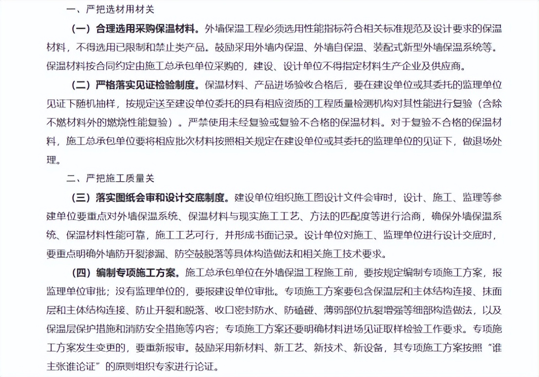 (一)合理選用采購保溫材料。外墻保溫工程必須選用性能指標(biāo)符合相關(guān)標(biāo)準(zhǔn)規(guī)范及設(shè)計(jì)要求的保溫材料,不得選用已限制和禁止類產(chǎn)品。鼓勵(lì)采用外墻內(nèi)保溫、外墻自保溫、裝配式新型外墻保溫系統(tǒng)等。保溫材料按合同約定由施工總承包單位采購的,建設(shè)、設(shè)計(jì)單位不得指定材料生產(chǎn)企業(yè)及供應(yīng)商。