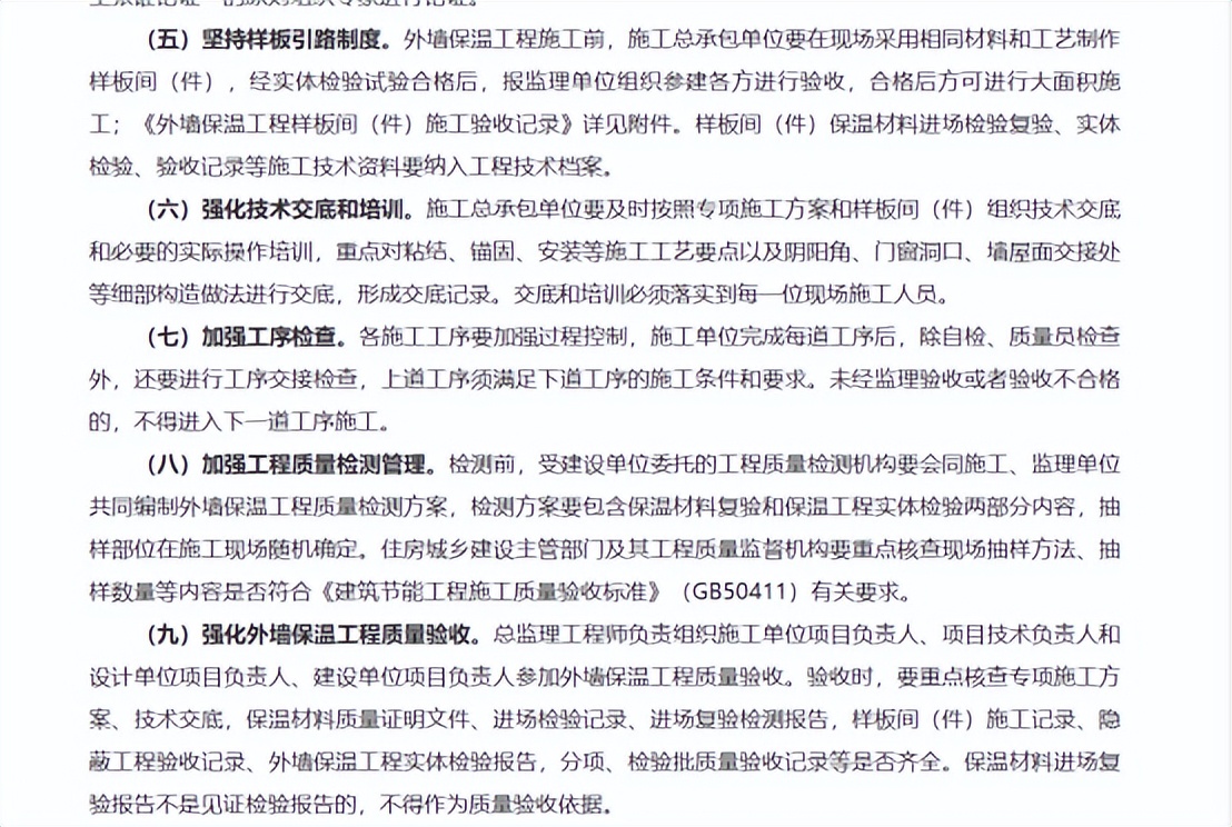 (九)強(qiáng)化外墻保溫工程質(zhì)量驗(yàn)收。總監(jiān)理工程師負(fù)責(zé)組織施工單位項(xiàng)目負(fù)責(zé)人、項(xiàng)目技術(shù)負(fù)責(zé)人和設(shè)計(jì)單位項(xiàng)目負(fù)責(zé)人、建設(shè)單位項(xiàng)目負(fù)責(zé)人參加外墻保溫工程質(zhì)量驗(yàn)收。驗(yàn)收時(shí),要重點(diǎn)核查專項(xiàng)施工方案、技術(shù)交底,保溫材料質(zhì)量證明文件、進(jìn)場檢驗(yàn)記錄、進(jìn)場復(fù)驗(yàn)檢測報(bào)告,樣板間(件)施工記錄、隱蔽工程驗(yàn)收記錄、外墻保溫工程實(shí)體檢驗(yàn)報(bào)告,分項(xiàng)、檢驗(yàn)批質(zhì)量驗(yàn)收記錄等是否齊全。保溫材料進(jìn)場復(fù)驗(yàn)報(bào)告不是見證檢驗(yàn)報(bào)告的,不得作為質(zhì)量驗(yàn)收依據(jù)。