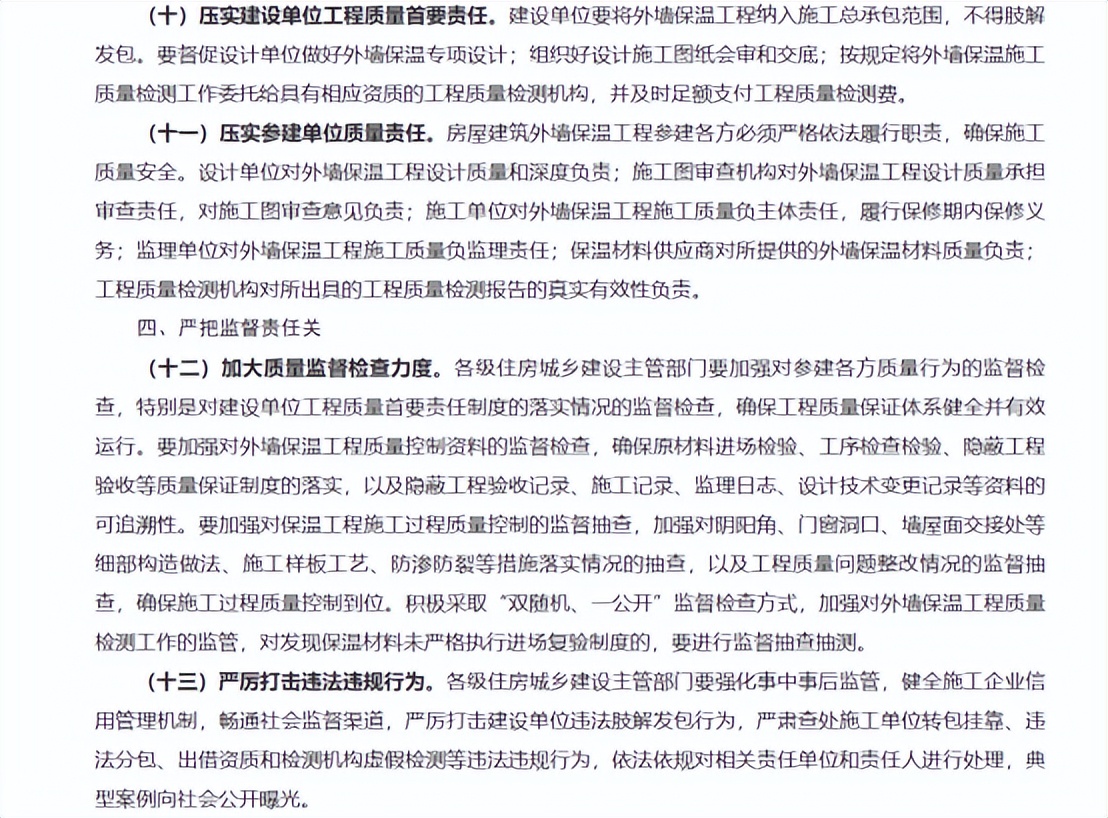 (十一)壓實(shí)參建單位質(zhì)量責(zé)任。房屋建筑外墻保溫工程參建各方必須嚴(yán)格依法履行職責(zé),確保施工質(zhì)量安全。設(shè)計(jì)單位對外墻保溫工程設(shè)計(jì)質(zhì)量和深度負(fù)責(zé);施工圖審查機(jī)構(gòu)對外墻保溫工程設(shè)計(jì)質(zhì)量承擔(dān)審查責(zé)任,對施工圖審查意見負(fù)責(zé);施工單位對外墻保溫工程施工質(zhì)量負(fù)主體責(zé)任,履行保修期內(nèi)保修義務(wù);監(jiān)理單位對外墻保溫工程施工質(zhì)量負(fù)監(jiān)理責(zé)任;保溫材料供應(yīng)商對所提供的外墻保溫材料質(zhì)量負(fù)責(zé);工程質(zhì)量檢測機(jī)構(gòu)對所出具的工程質(zhì)量檢測報(bào)告的真實(shí)有效性負(fù)責(zé)。